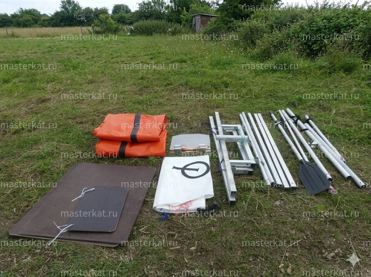 Баллоны 350см Д40см – 2 шт Рама катамарана Парусное вооружение 3.7м² - Мачта, гик, мачтовый стакан с торсионами, парус "Бермудский грот" 3.7м² Шверц-кили – комплект из 2 штук Рулевое весло Жёсткая пассажирская палуба из фанеры Лавки 2 шт Ножной насос |